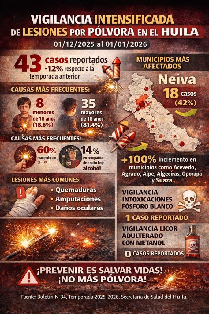 El Boletín Nº 34 de la Secretaria de Salud del Huila, evidencia que, durante la temporada decembrina 2025–2026, las lesiones por pólvora pirotécnica en el Huila disminuyeron un 12,2% frente al mismo periodo 2024–2025, pasando de 49 a 43 casos. Esta reducción refleja el impacto positivo de las campañas de prevención y control, aunque la problemática persiste, especialmente en municipios con incrementos porcentuales significativos.